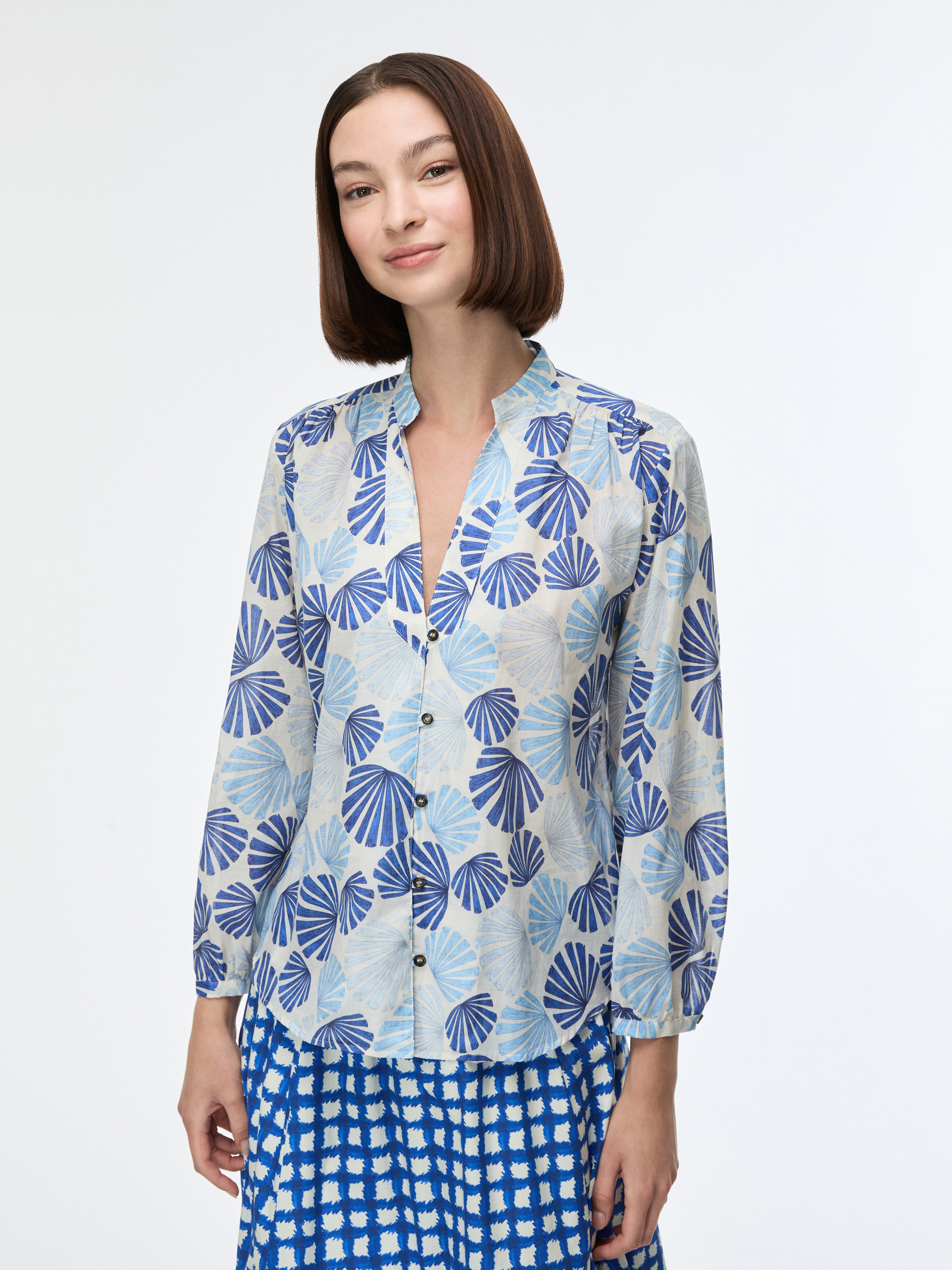 - V-slit round neckline, and loose-fitting long sleeves with gathered cuffs